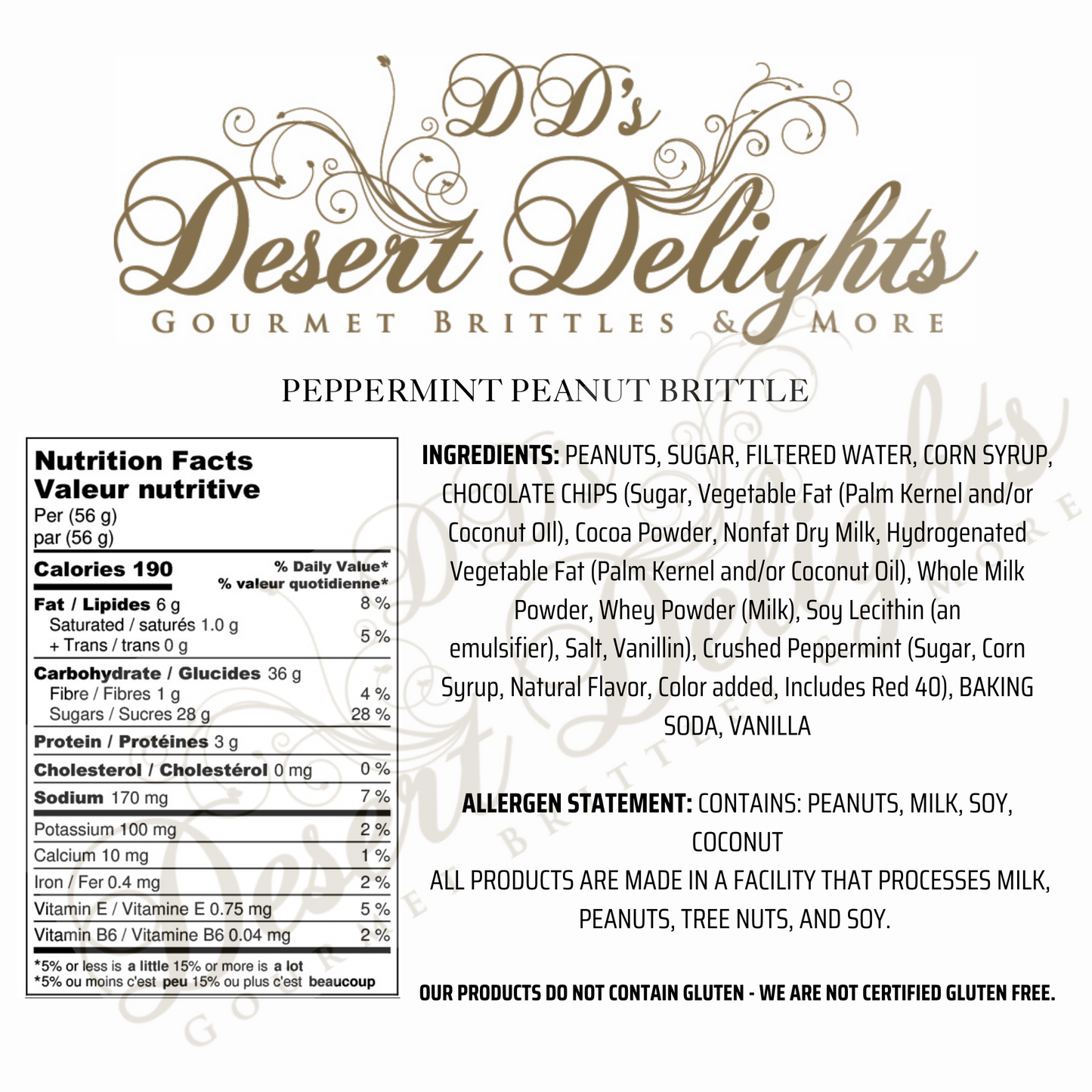 A delightful trio of flavors awaits you in our Peppermint Peanut Brittle. First - a layer of golden peanut brittle with perfectly toasted nuts, next a sweet chocolate embrace, and finally a generous sprinkle of refreshing peppermint pieces.